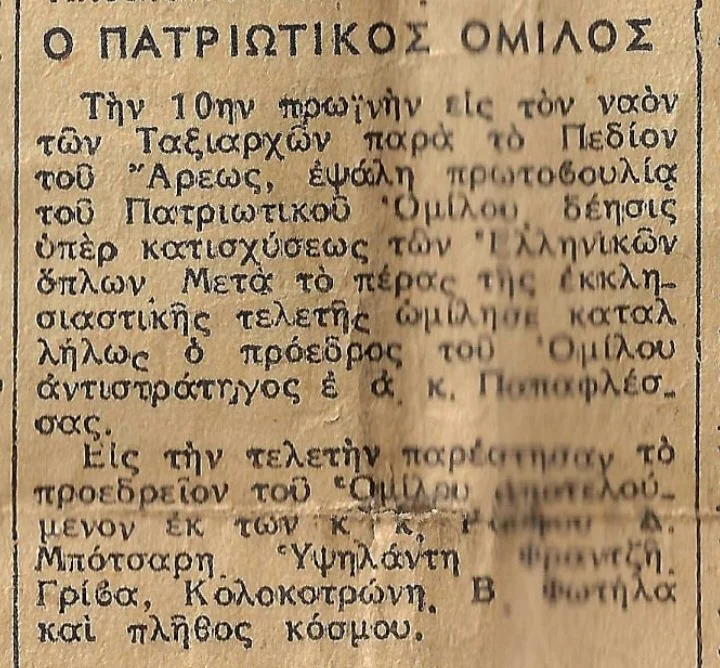 παρὰ τὸ Πεδίον ᾿Αρεως, ἐψάλη πρωτοβουλία τοῦ Πατριωτικού Ομίλου, δέησις ὑπὲρ κατισχύσεως τῶν Ἑλληνικῶν ὅπλων. Μετὰ τὸ πέρας τῆς ἐκκλησιαστικῆς τελετῆς ὠμίλησε καταλλήλως ο πρόεδρος του Ομίλου ἀντιστράτηγος ε.α Παπαφλέσσας